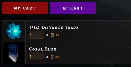 Two new carts have been added to the website: one for items purchased with Market Points and one for items purchased with Exile Points.